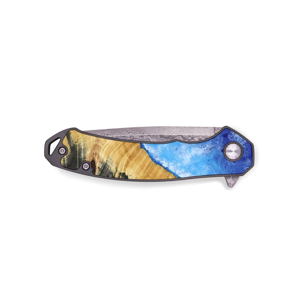 Experience the perfect blend of form and function with our durable folding pocket knife, featuring a lightweight titanium handle. The Damascus stainless steel blade is complemented by a unique wood burl and resin inlay. Imported blade and handle.