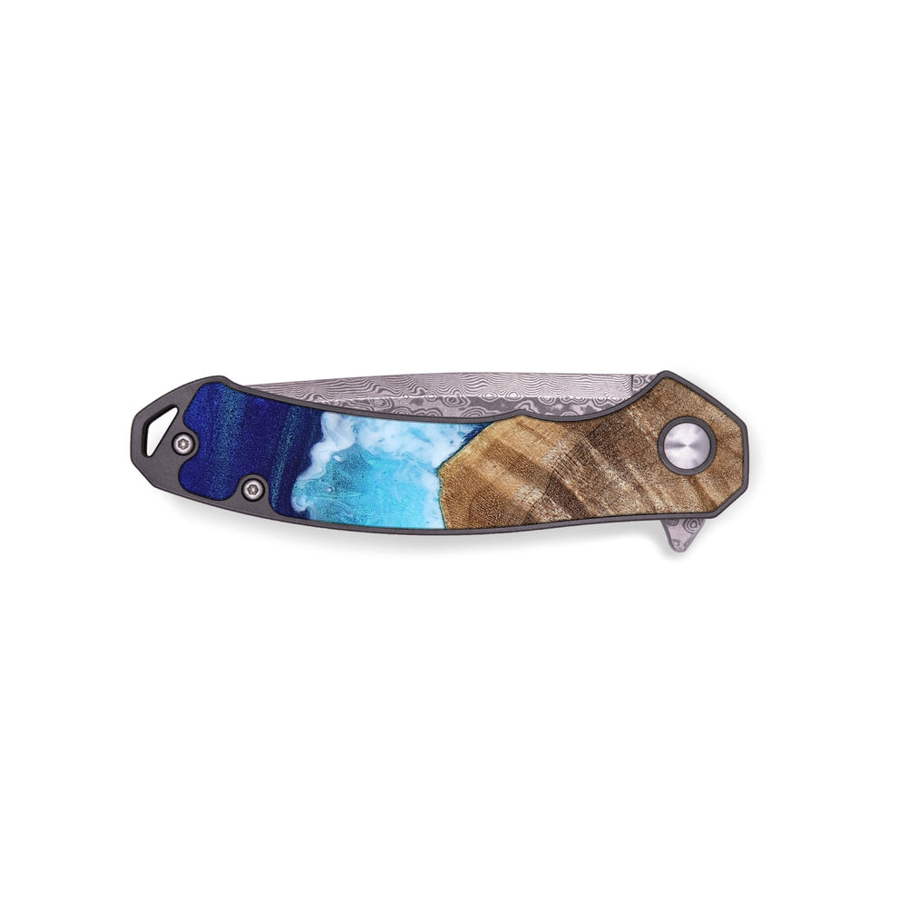 Experience the perfect blend of form and function with our durable folding pocket knife, featuring a lightweight titanium handle. The Damascus stainless steel blade is complemented by a unique wood burl and resin inlay. Imported blade and handle.