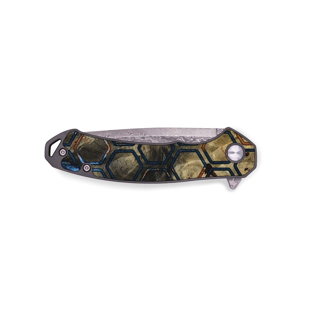Experience the perfect blend of form and function with our durable folding pocket knife, featuring a lightweight titanium handle. The Damascus stainless steel blade is complemented by a unique wood burl and resin inlay. Imported blade and handle.