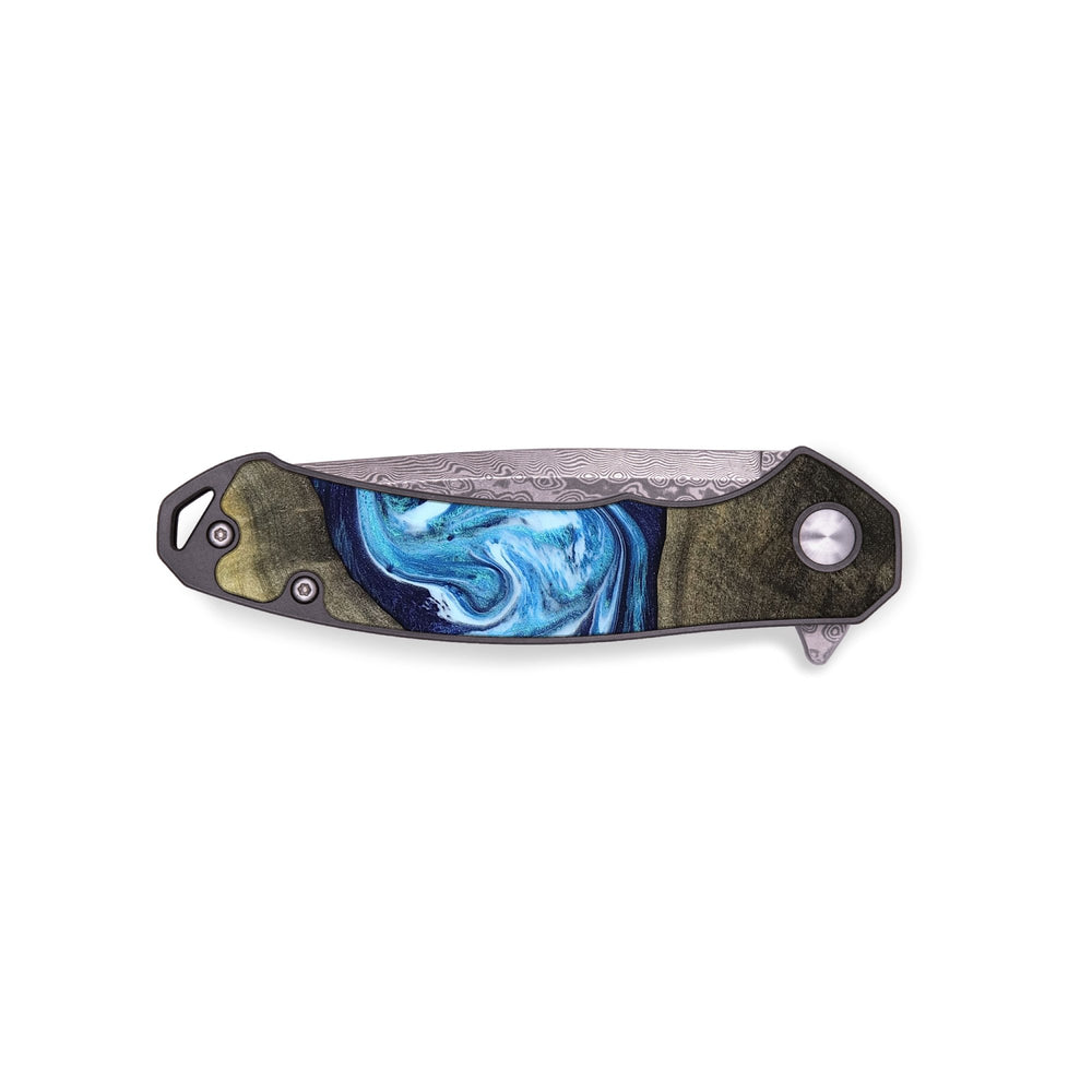 Experience the perfect blend of form and function with our durable folding pocket knife, featuring a lightweight titanium handle. The Damascus stainless steel blade is complemented by a unique wood burl and resin inlay. Imported blade and handle.