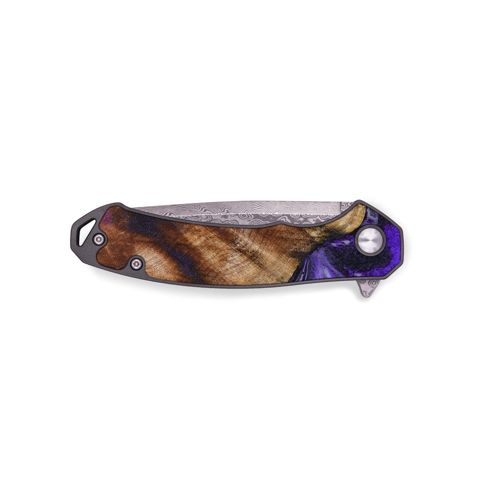 Experience the perfect blend of form and function with our durable folding pocket knife, featuring a lightweight titanium handle. The Damascus stainless steel blade is complemented by a unique wood burl and resin inlay. Imported blade and handle.