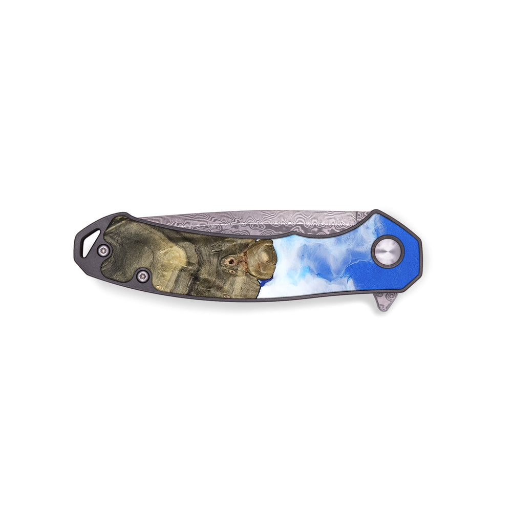 Experience the perfect blend of form and function with our durable folding pocket knife, featuring a lightweight titanium handle. The Damascus stainless steel blade is complemented by a unique wood burl and resin inlay. Imported blade and handle.