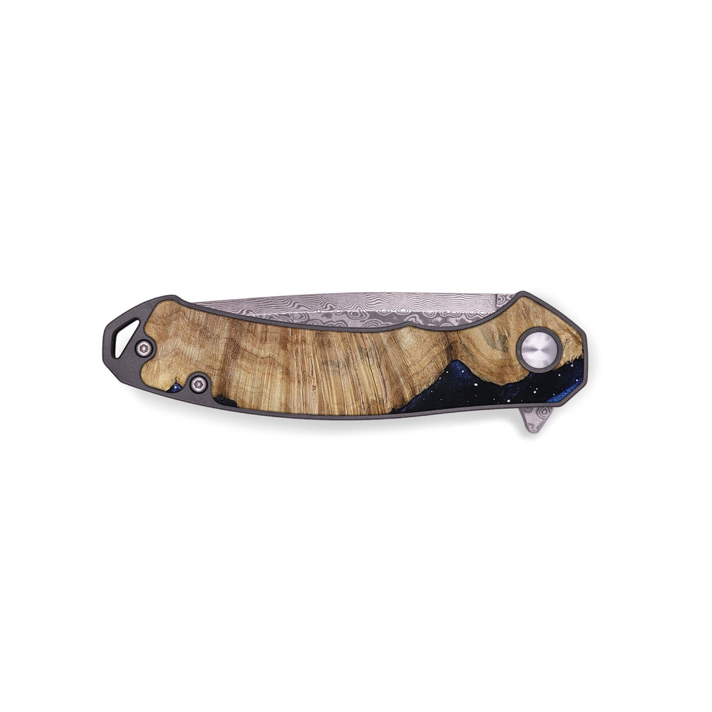 Experience the perfect blend of form and function with our durable folding pocket knife, featuring a lightweight titanium handle. The Damascus stainless steel blade is complemented by a unique wood burl and resin inlay. Imported blade and handle.