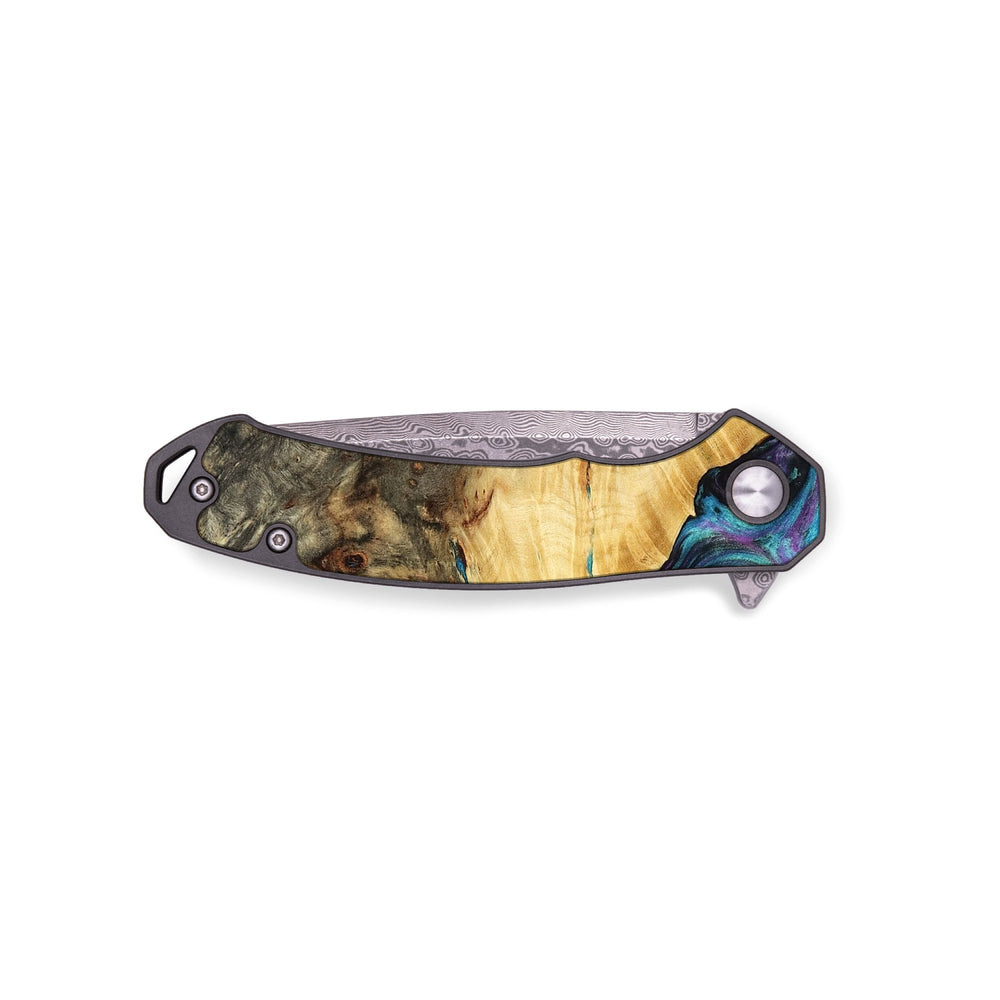 Experience the perfect blend of form and function with our durable folding pocket knife, featuring a lightweight titanium handle. The Damascus stainless steel blade is complemented by a unique wood burl and resin inlay. Imported blade and handle.