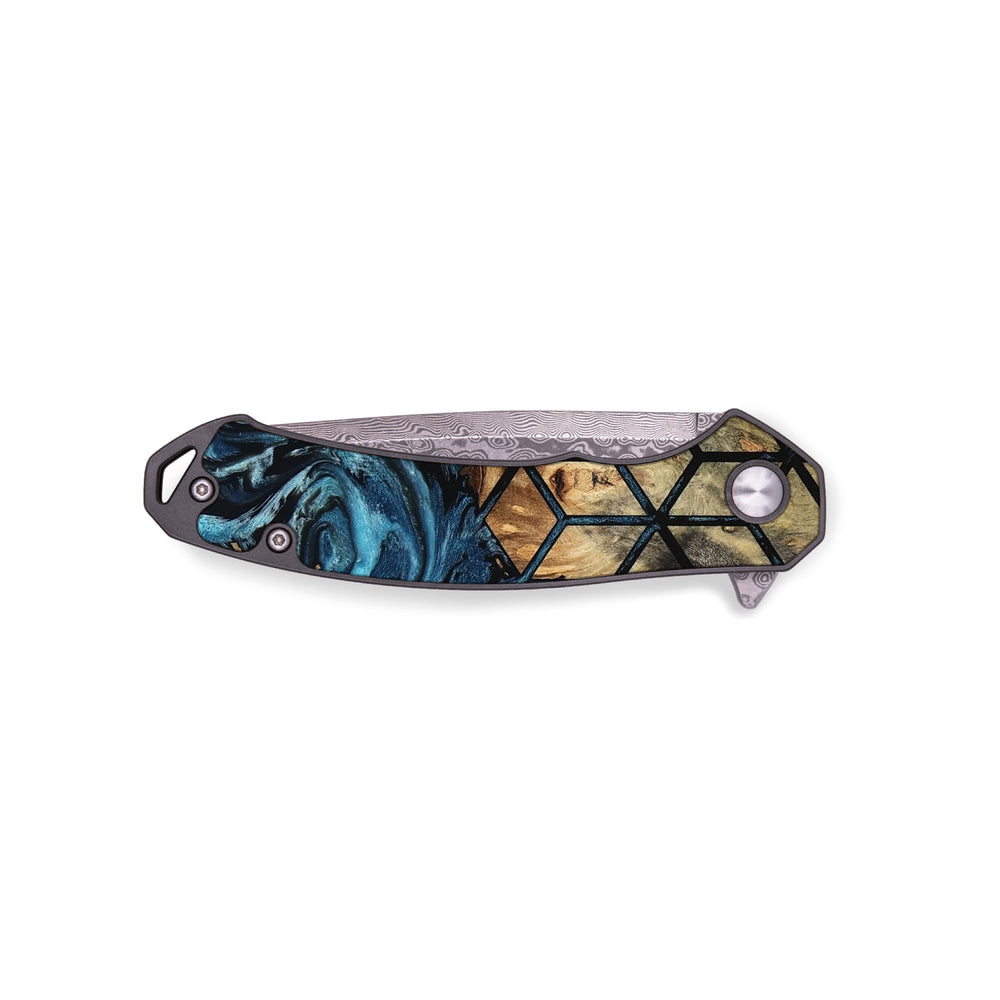 Experience the perfect blend of form and function with our durable folding pocket knife, featuring a lightweight titanium handle. The Damascus stainless steel blade is complemented by a unique wood burl and resin inlay. Imported blade and handle.