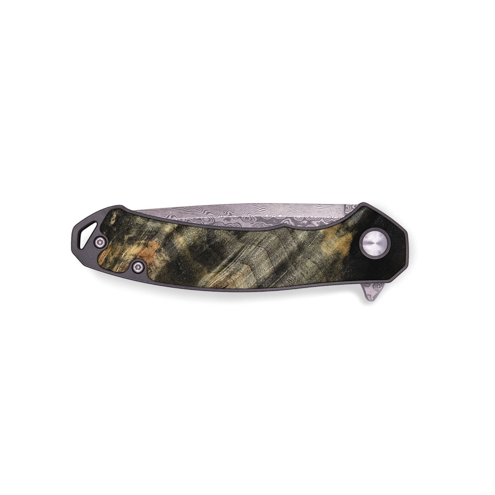 Experience the perfect blend of form and function with our durable folding pocket knife, featuring a lightweight titanium handle. The Damascus stainless steel blade is complemented by a unique wood burl and resin inlay. Imported blade and handle.