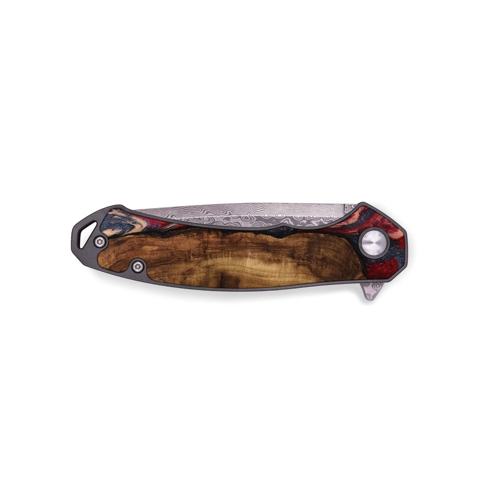 Experience the perfect blend of form and function with our durable folding pocket knife, featuring a lightweight titanium handle. The Damascus stainless steel blade is complemented by a unique wood burl and resin inlay. Imported blade and handle.
