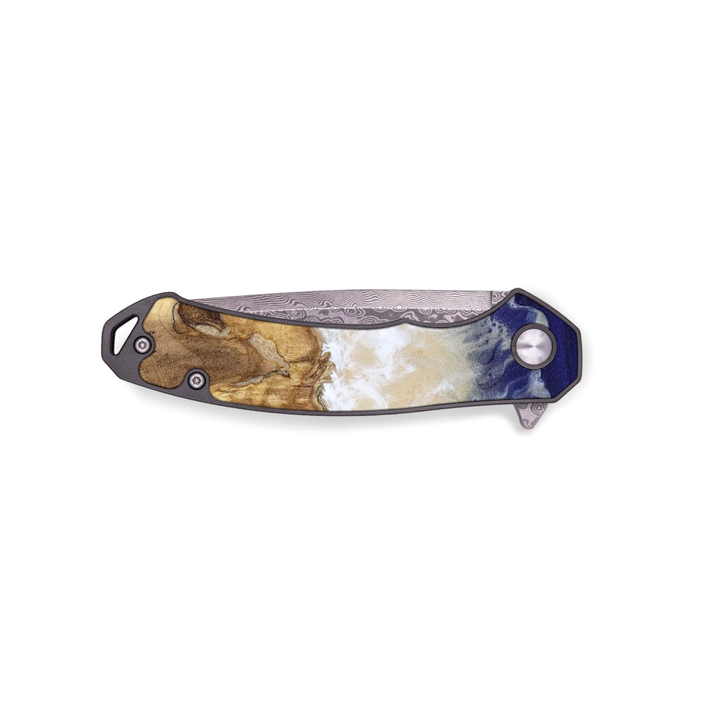 Experience the perfect blend of form and function with our durable folding pocket knife, featuring a lightweight titanium handle. The Damascus stainless steel blade is complemented by a unique wood burl and resin inlay. Imported blade and handle.