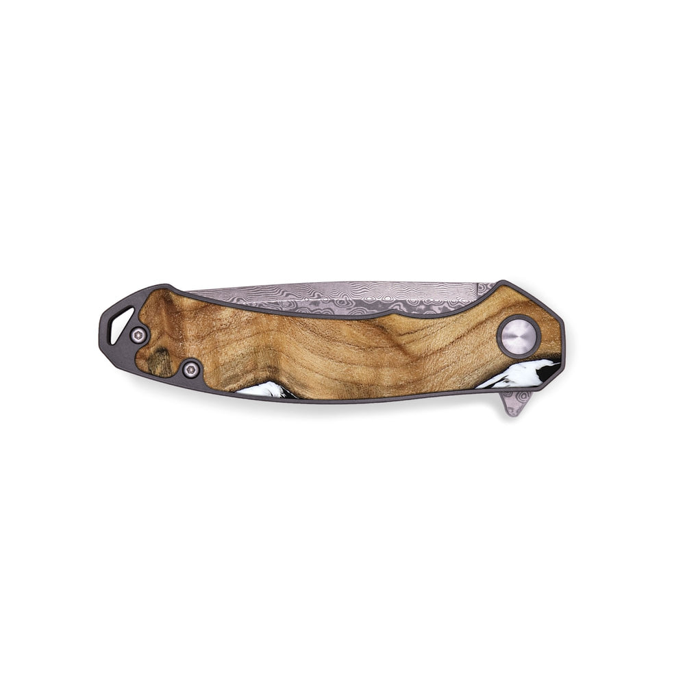 Experience the perfect blend of form and function with our durable folding pocket knife, featuring a lightweight titanium handle. The Damascus stainless steel blade is complemented by a unique wood burl and resin inlay. Imported blade and handle.