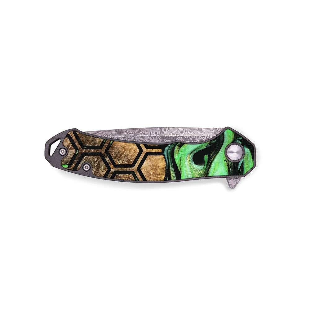 Experience the perfect blend of form and function with our durable folding pocket knife, featuring a lightweight titanium handle. The Damascus stainless steel blade is complemented by a unique wood burl and resin inlay. Imported blade and handle.