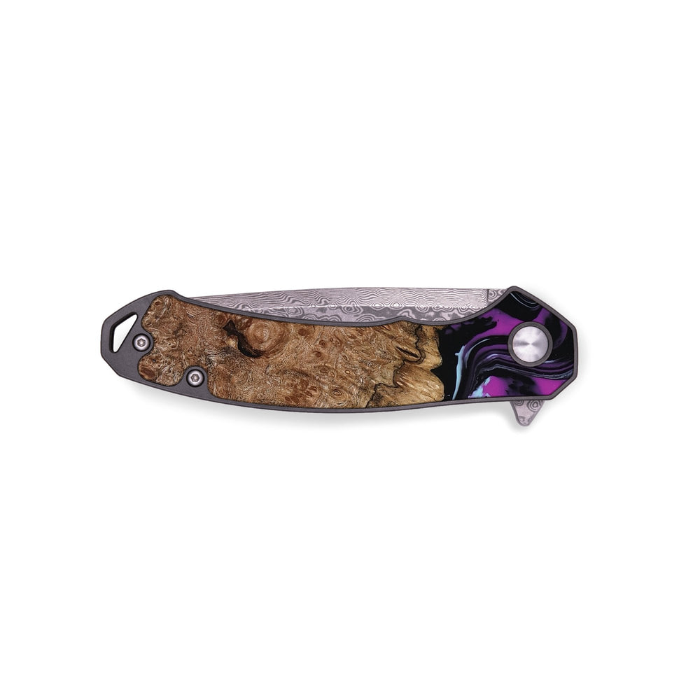 Experience the perfect blend of form and function with our durable folding pocket knife, featuring a lightweight titanium handle. The Damascus stainless steel blade is complemented by a unique wood burl and resin inlay. Imported blade and handle.