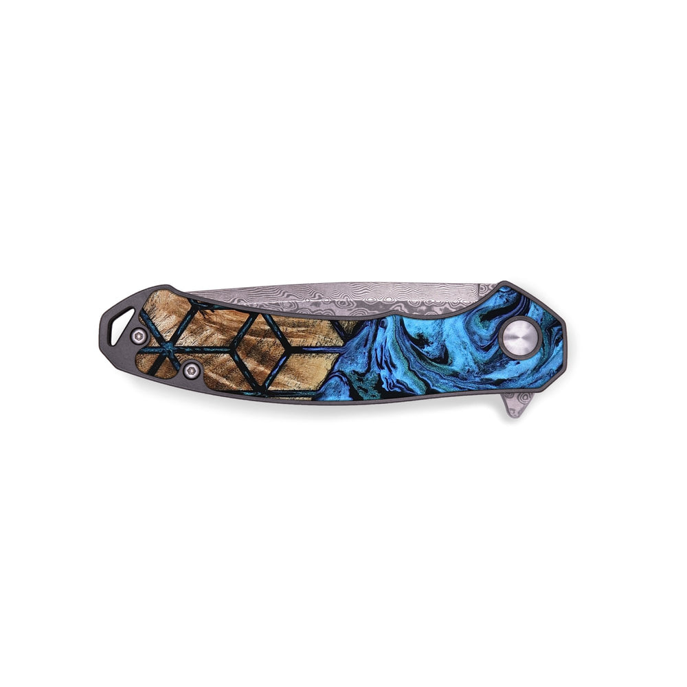 Experience the perfect blend of form and function with our durable folding pocket knife, featuring a lightweight titanium handle. The Damascus stainless steel blade is complemented by a unique wood burl and resin inlay. Imported blade and handle.