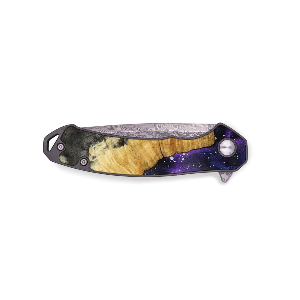 Experience the perfect blend of form and function with our durable folding pocket knife, featuring a lightweight titanium handle. The Damascus stainless steel blade is complemented by a unique wood burl and resin inlay. Imported blade and handle.