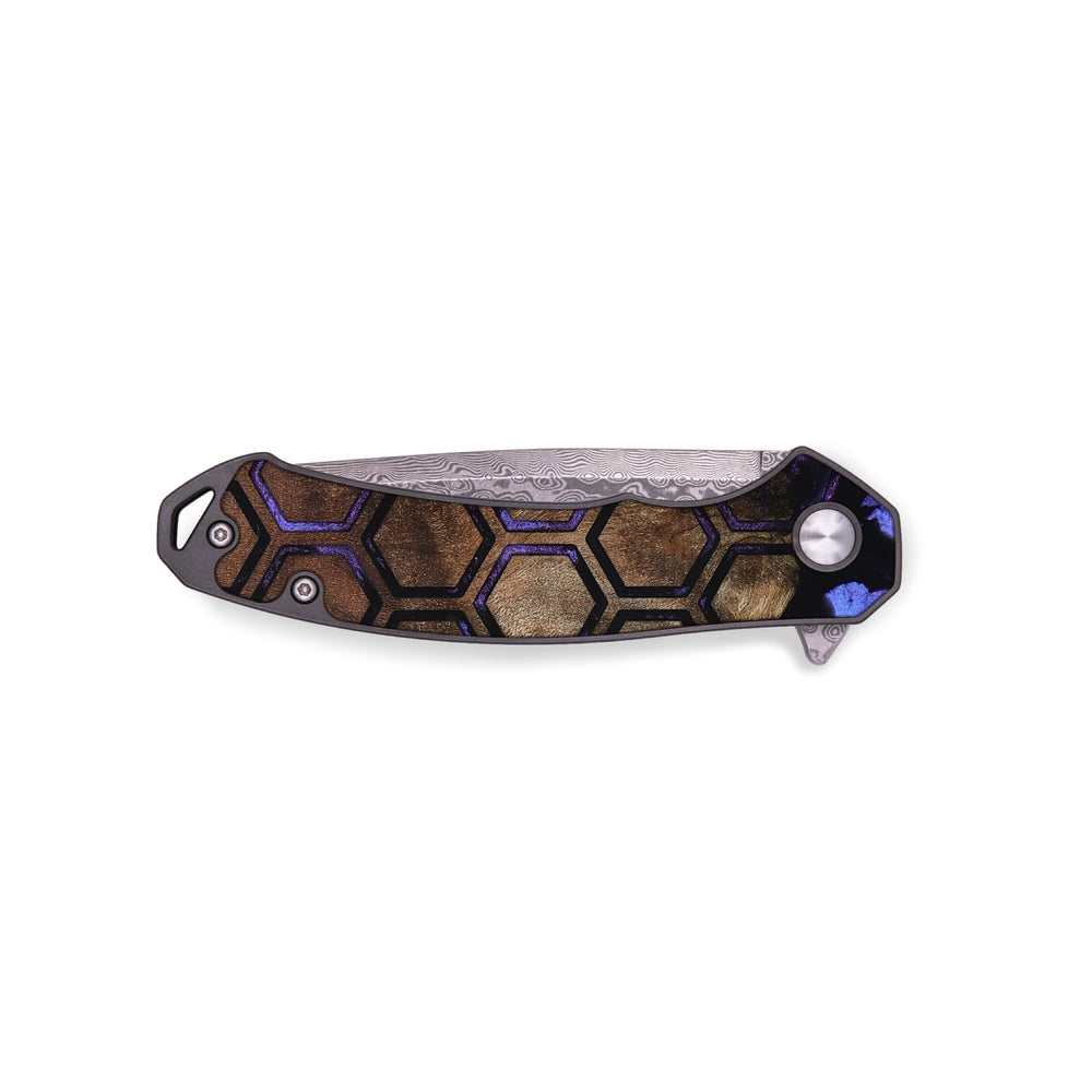 Experience the perfect blend of form and function with our durable folding pocket knife, featuring a lightweight titanium handle. The Damascus stainless steel blade is complemented by a unique wood burl and resin inlay. Imported blade and handle.