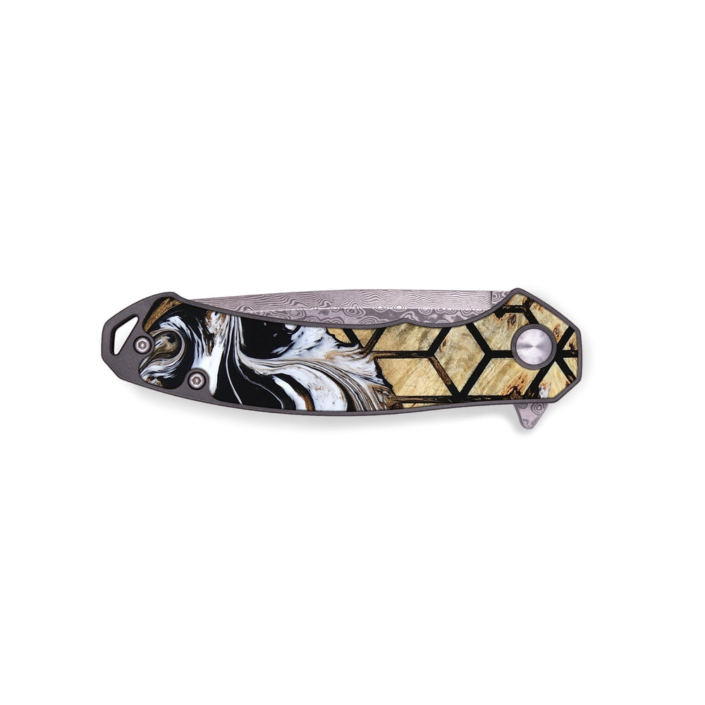 Experience the perfect blend of form and function with our durable folding pocket knife, featuring a lightweight titanium handle. The Damascus stainless steel blade is complemented by a unique wood burl and resin inlay. Imported blade and handle.