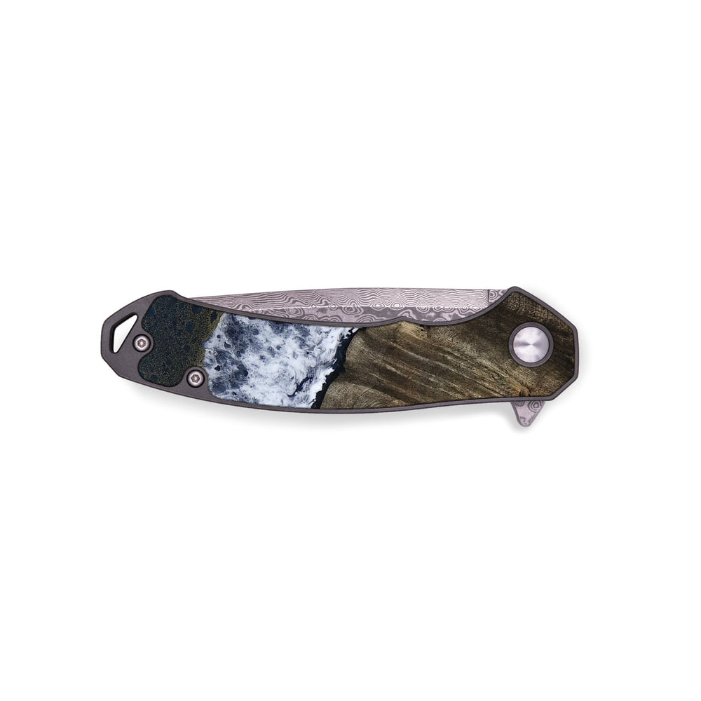 Experience the perfect blend of form and function with our durable folding pocket knife, featuring a lightweight titanium handle. The Damascus stainless steel blade is complemented by a unique wood burl and resin inlay. Imported blade and handle.