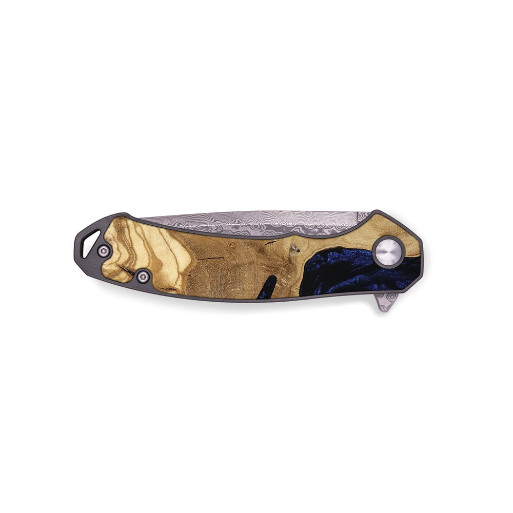 Experience the perfect blend of form and function with our durable folding pocket knife, featuring a lightweight titanium handle. The Damascus stainless steel blade is complemented by a unique wood burl and resin inlay. Imported blade and handle.