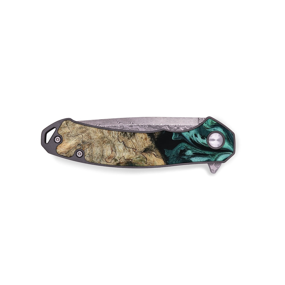 Experience the perfect blend of form and function with our durable folding pocket knife, featuring a lightweight titanium handle. The Damascus stainless steel blade is complemented by a unique wood burl and resin inlay. Imported blade and handle.