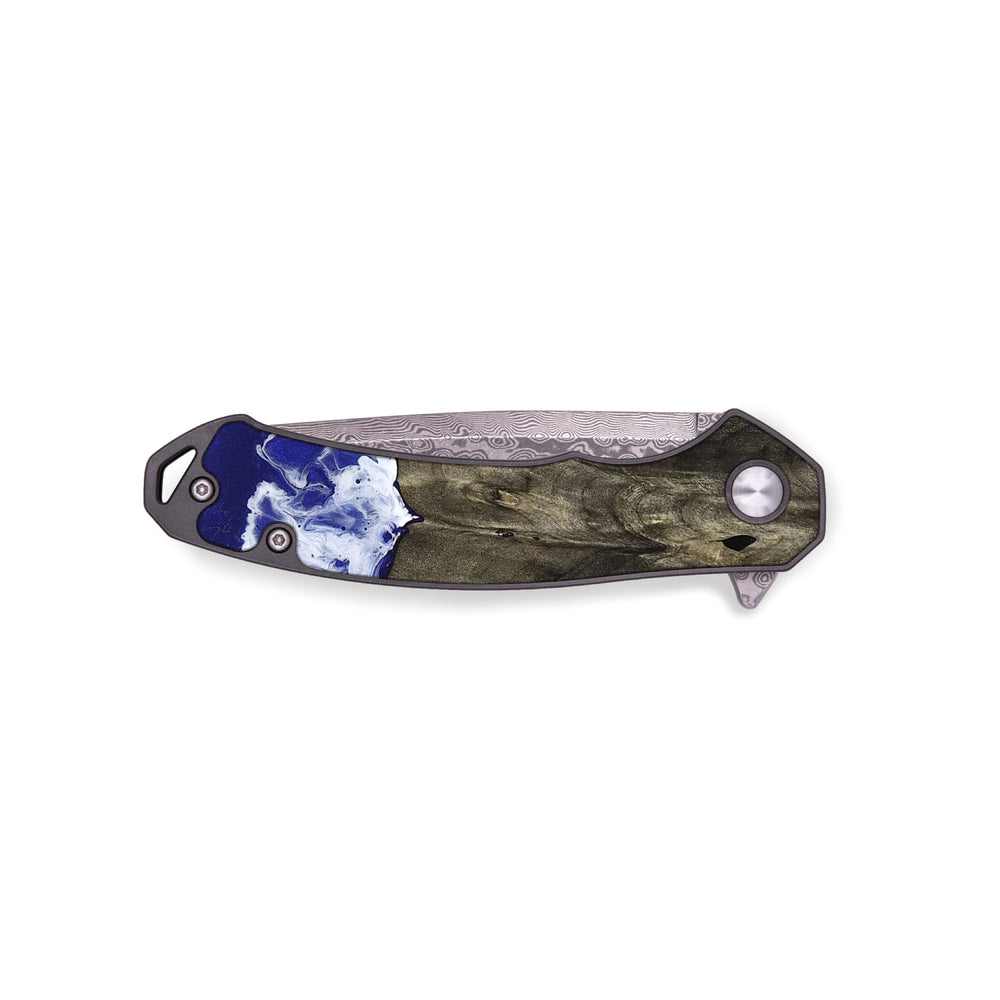 Experience the perfect blend of form and function with our durable folding pocket knife, featuring a lightweight titanium handle. The Damascus stainless steel blade is complemented by a unique wood burl and resin inlay. Imported blade and handle.