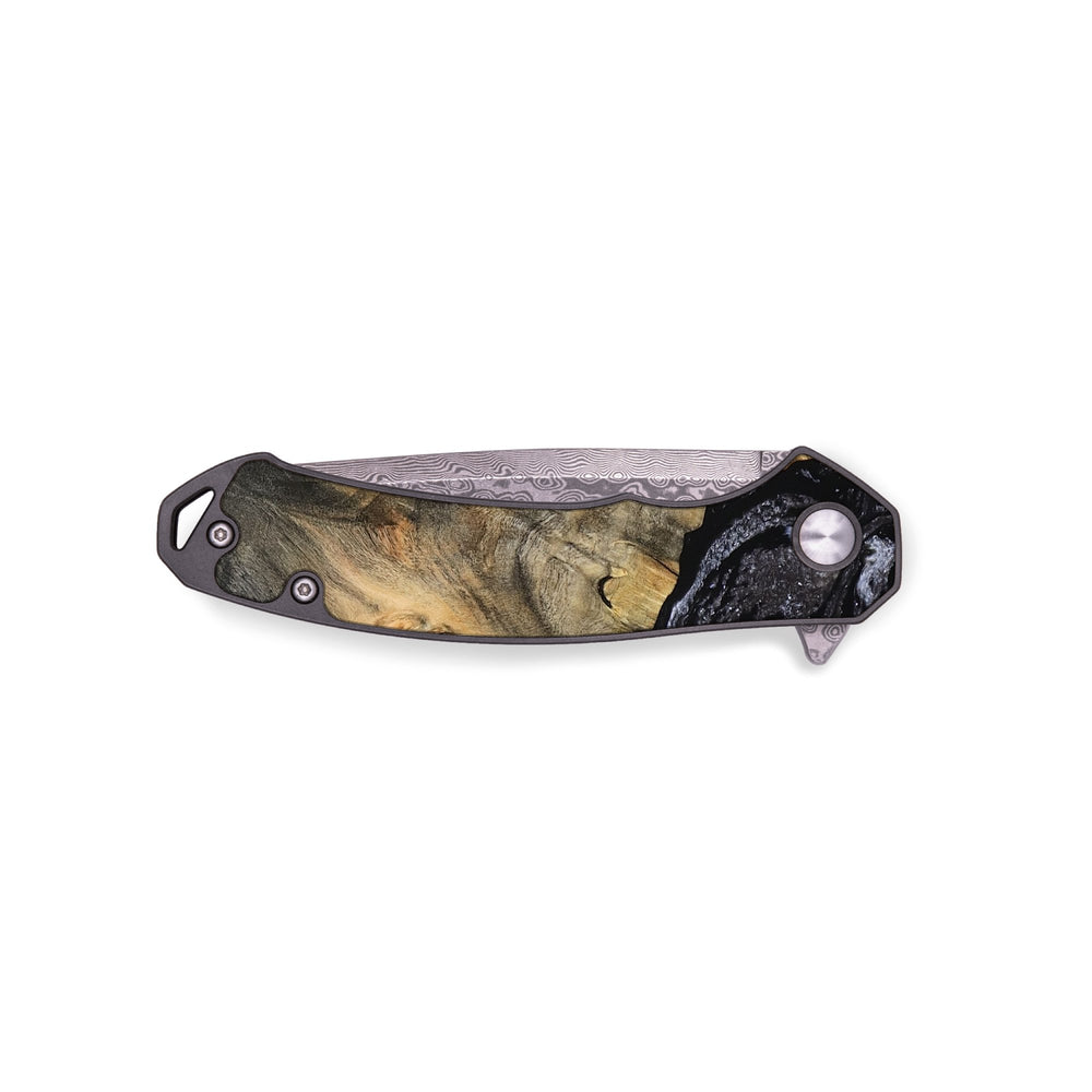 Experience the perfect blend of form and function with our durable folding pocket knife, featuring a lightweight titanium handle. The Damascus stainless steel blade is complemented by a unique wood burl and resin inlay. Imported blade and handle.