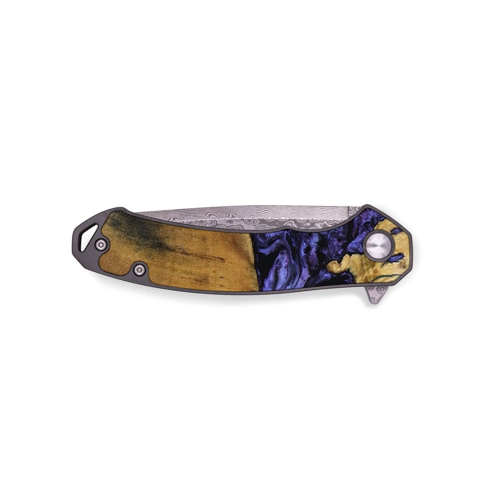 Experience the perfect blend of form and function with our durable folding pocket knife, featuring a lightweight titanium handle. The Damascus stainless steel blade is complemented by a unique wood burl and resin inlay. Imported blade and handle.