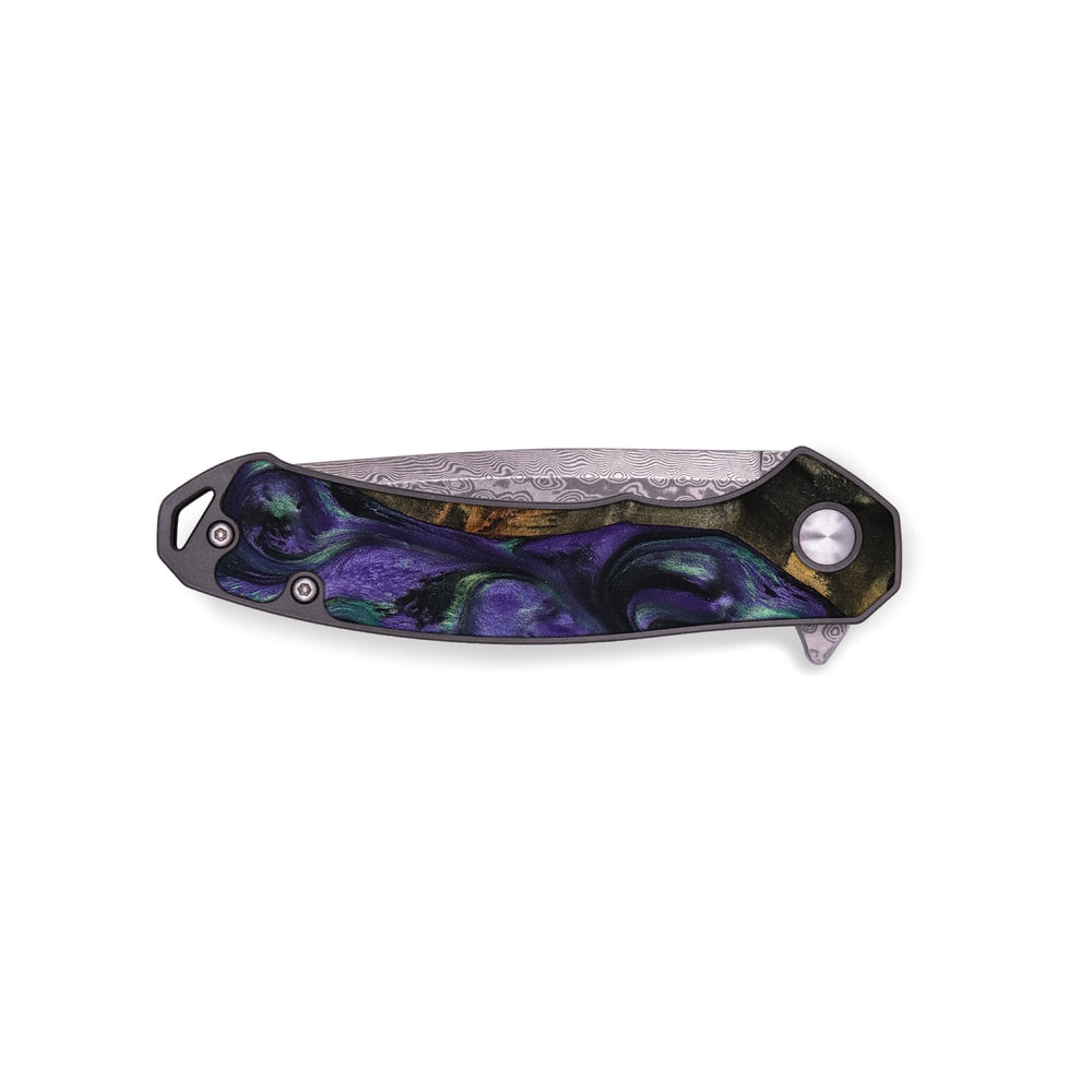 Experience the perfect blend of form and function with our durable folding pocket knife, featuring a lightweight titanium handle. The Damascus stainless steel blade is complemented by a unique wood burl and resin inlay. Imported blade and handle.