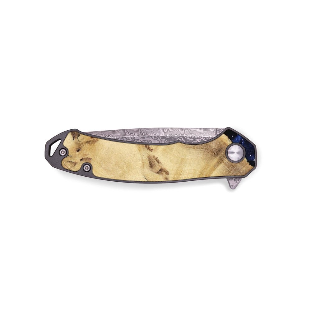 Experience the perfect blend of form and function with our durable folding pocket knife, featuring a lightweight titanium handle. The Damascus stainless steel blade is complemented by a unique wood burl and resin inlay. Imported blade and handle.