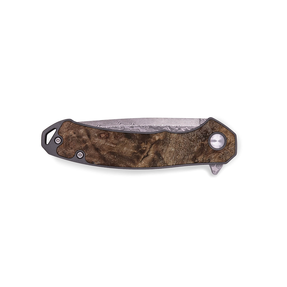Experience the perfect blend of form and function with our durable folding pocket knife, featuring a lightweight titanium handle. The Damascus stainless steel blade is complemented by a unique wood burl and resin inlay. Imported blade and handle.