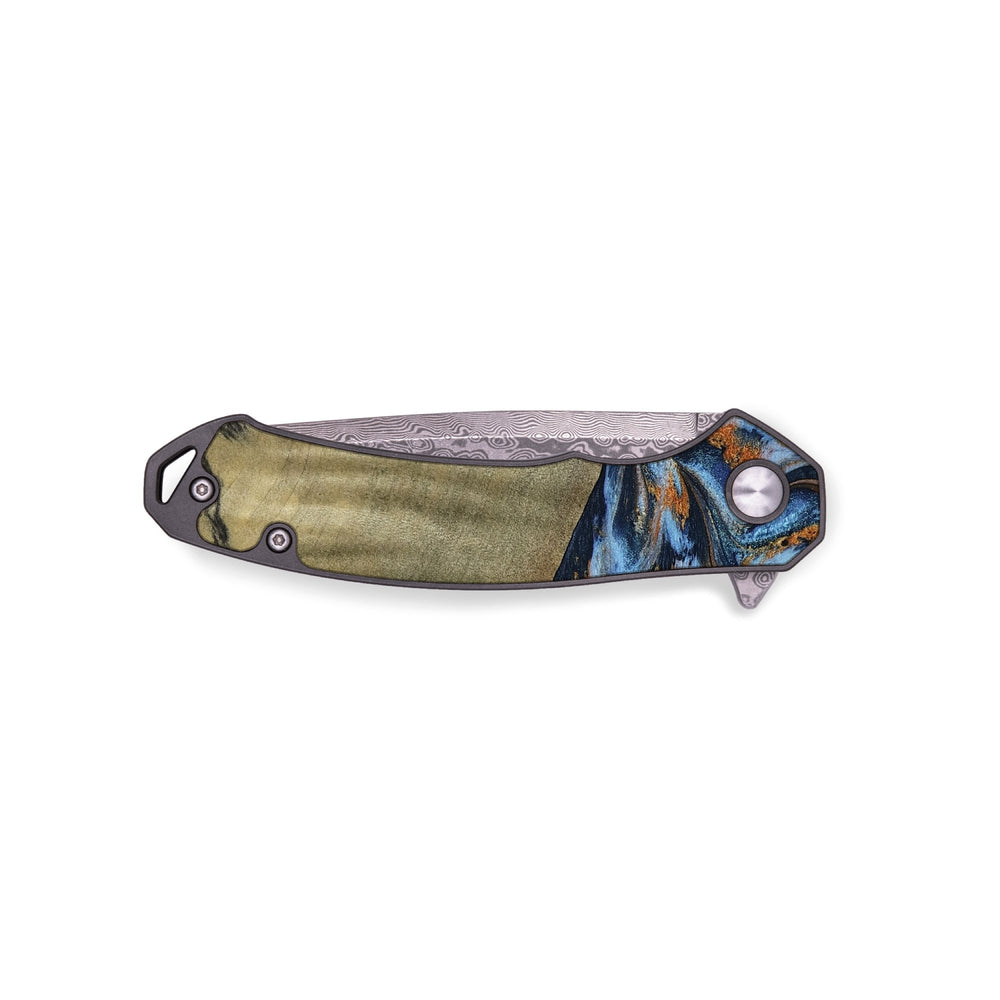 Experience the perfect blend of form and function with our durable folding pocket knife, featuring a lightweight titanium handle. The Damascus stainless steel blade is complemented by a unique wood burl and resin inlay. Imported blade and handle.