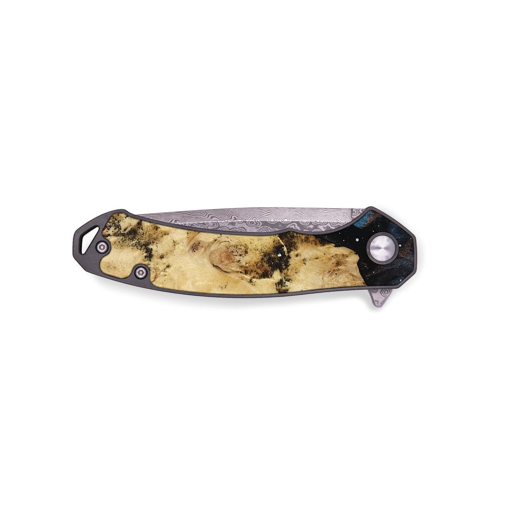 Experience the perfect blend of form and function with our durable folding pocket knife, featuring a lightweight titanium handle. The Damascus stainless steel blade is complemented by a unique wood burl and resin inlay. Imported blade and handle.