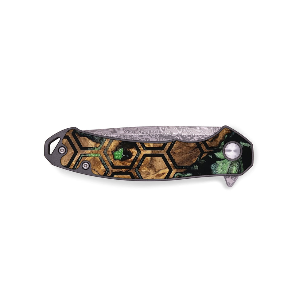 Experience the perfect blend of form and function with our durable folding pocket knife, featuring a lightweight titanium handle. The Damascus stainless steel blade is complemented by a unique wood burl and resin inlay. Imported blade and handle.