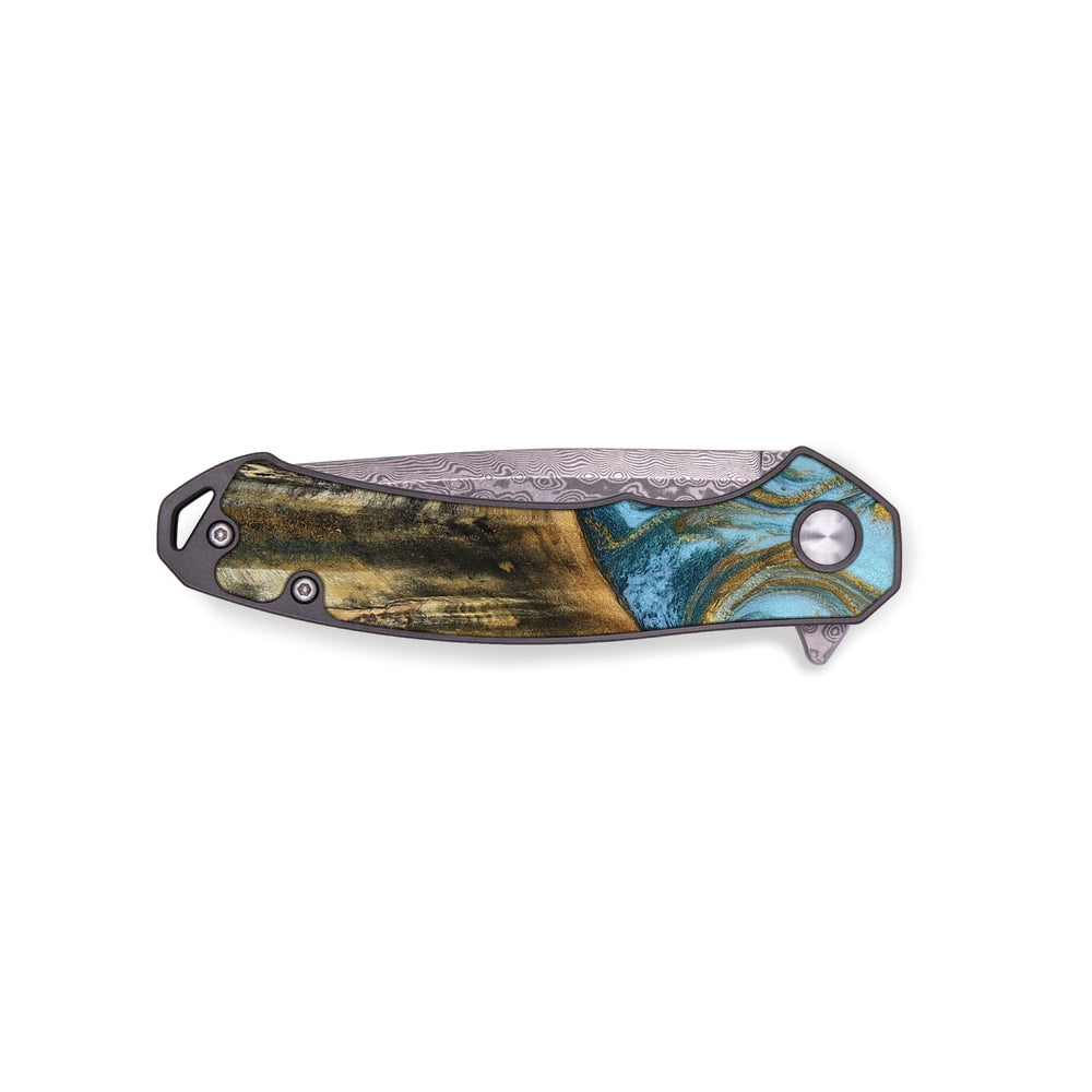 - Materials: Burl Wood, Resin, Damascus Stainless Steel