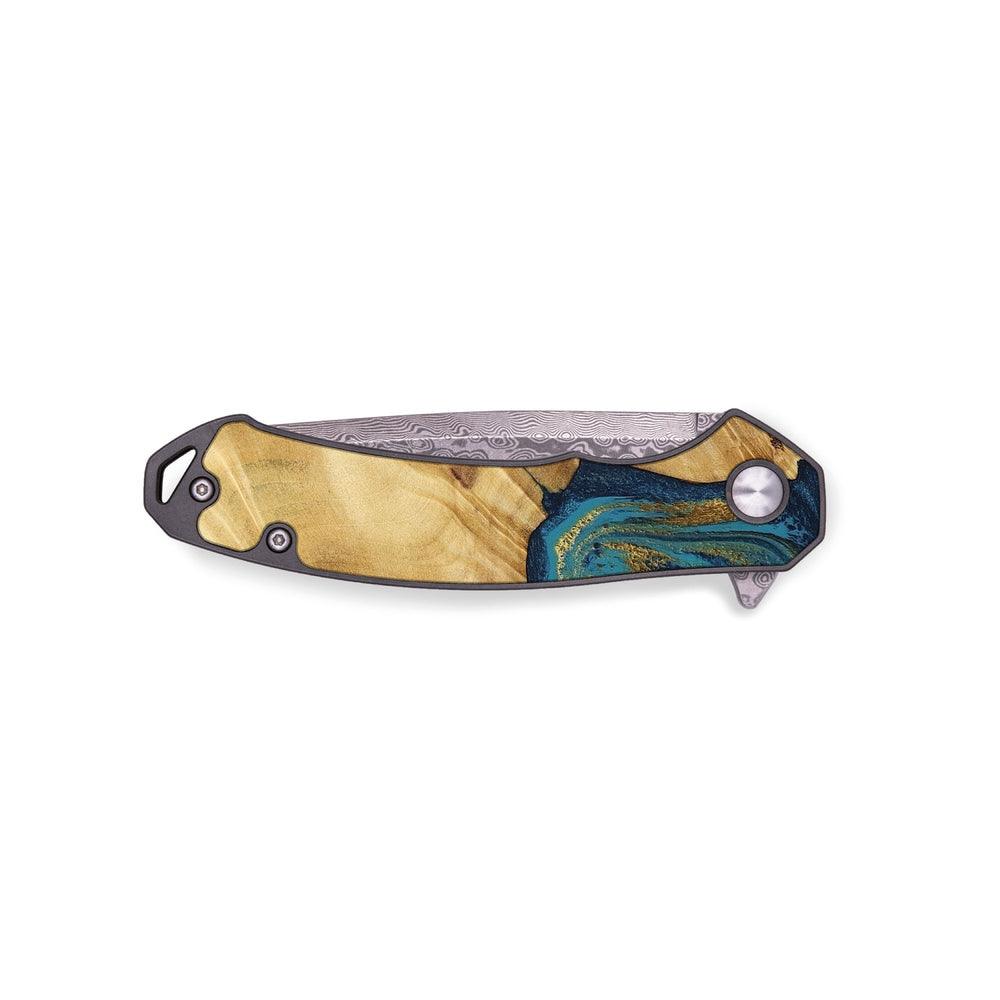 Experience the perfect blend of form and function with our durable folding pocket knife, featuring a lightweight titanium handle. The Damascus stainless steel blade is complemented by a unique wood burl and resin inlay. Imported blade and handle.
