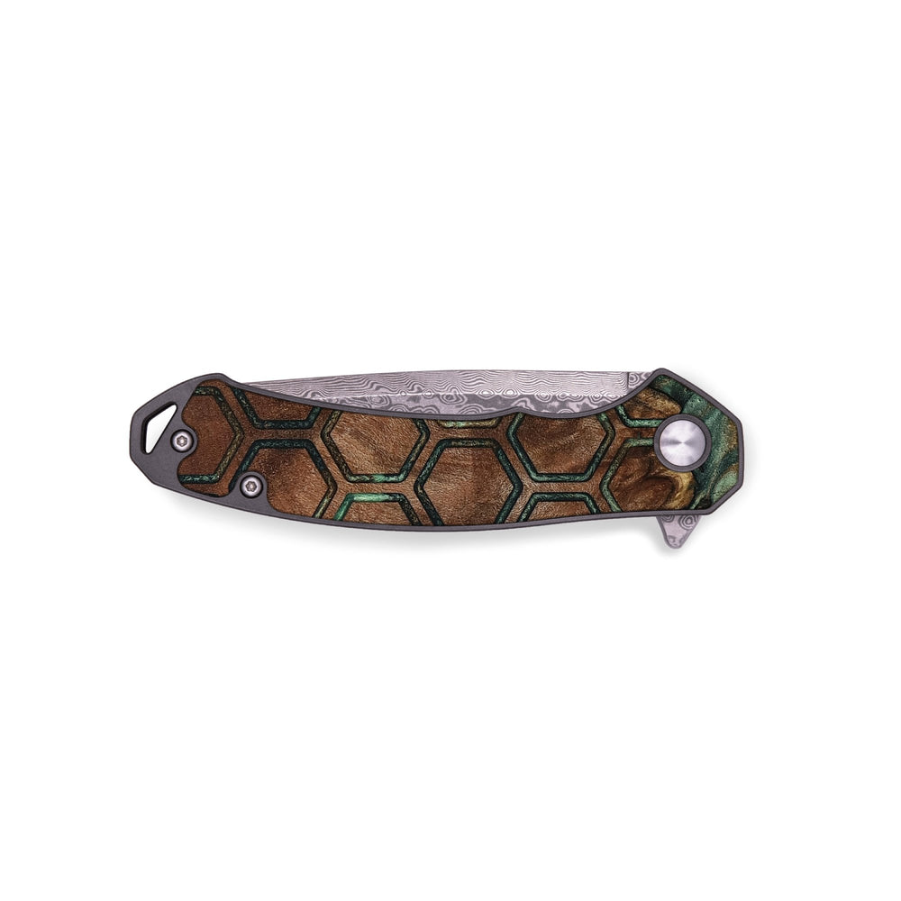 Experience the perfect blend of form and function with our durable folding pocket knife, featuring a lightweight titanium handle. The Damascus stainless steel blade is complemented by a unique wood burl and resin inlay. Imported blade and handle.