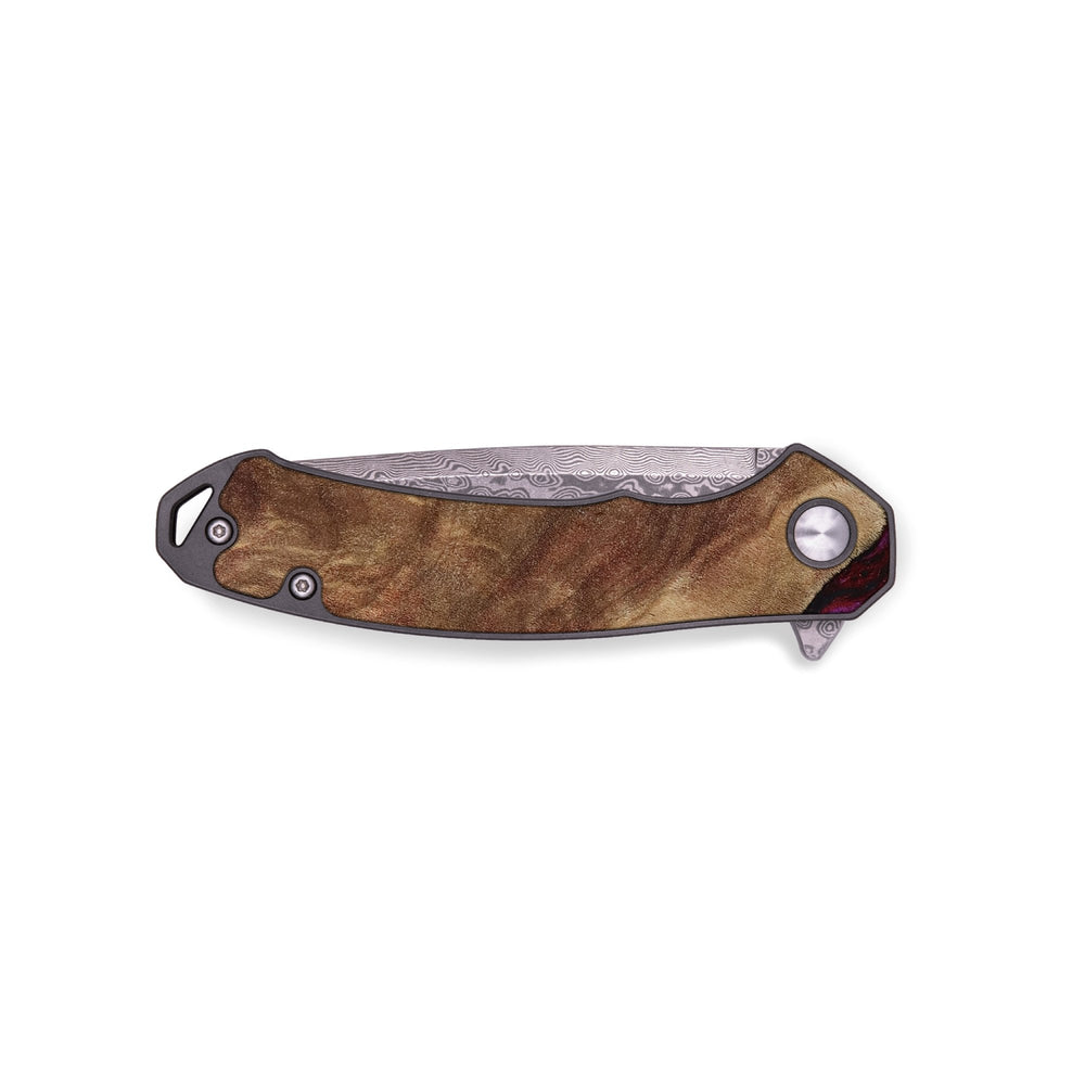 Experience the perfect blend of form and function with our durable folding pocket knife, featuring a lightweight titanium handle. The Damascus stainless steel blade is complemented by a unique wood burl and resin inlay. Imported blade and handle.