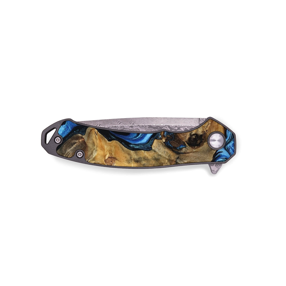 Experience the perfect blend of form and function with our durable folding pocket knife, featuring a lightweight titanium handle. The Damascus stainless steel blade is complemented by a unique wood burl and resin inlay. Imported blade and handle.
