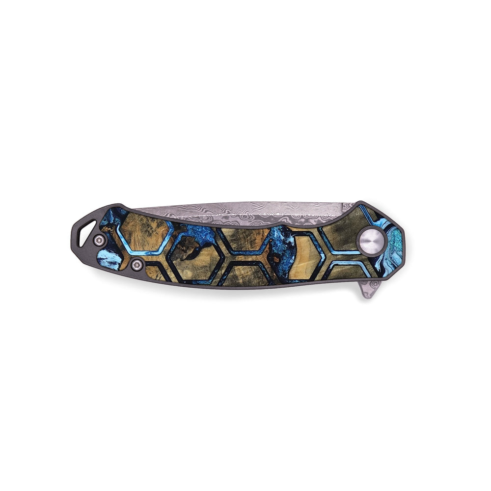 Experience the perfect blend of form and function with our durable folding pocket knife, featuring a lightweight titanium handle. The Damascus stainless steel blade is complemented by a unique wood burl and resin inlay. Imported blade and handle.