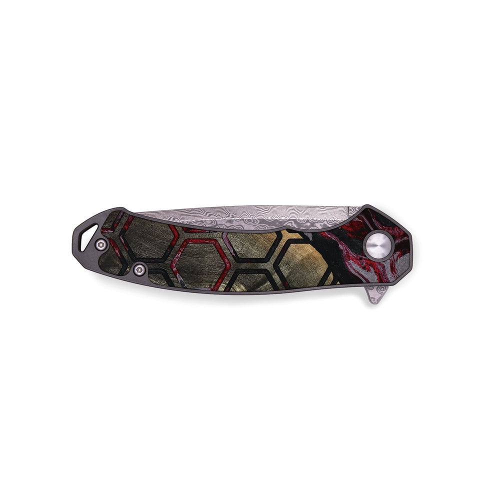 Experience the perfect blend of form and function with our durable folding pocket knife, featuring a lightweight titanium handle. The Damascus stainless steel blade is complemented by a unique wood burl and resin inlay. Imported blade and handle.