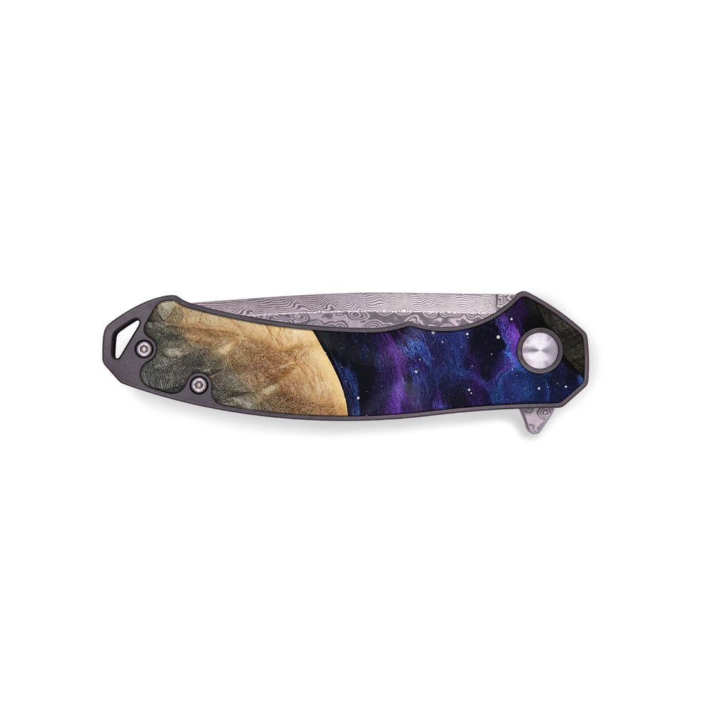 Experience the perfect blend of form and function with our durable folding pocket knife, featuring a lightweight titanium handle. The Damascus stainless steel blade is complemented by a unique wood burl and resin inlay. Imported blade and handle.