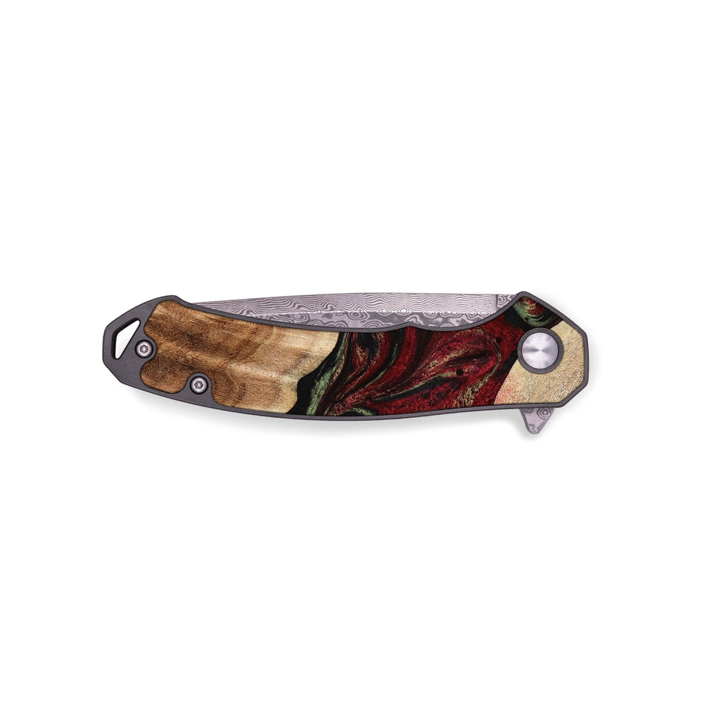 Experience the perfect blend of form and function with our durable folding pocket knife, featuring a lightweight titanium handle. The Damascus stainless steel blade is complemented by a unique wood burl and resin inlay. Imported blade and handle.