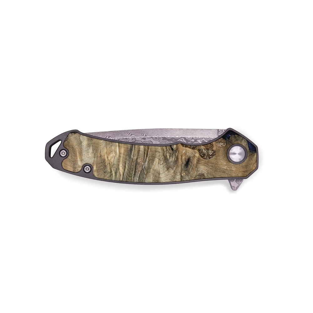Experience the perfect blend of form and function with our durable folding pocket knife, featuring a lightweight titanium handle. The Damascus stainless steel blade is complemented by a unique wood burl and resin inlay. Imported blade and handle.
