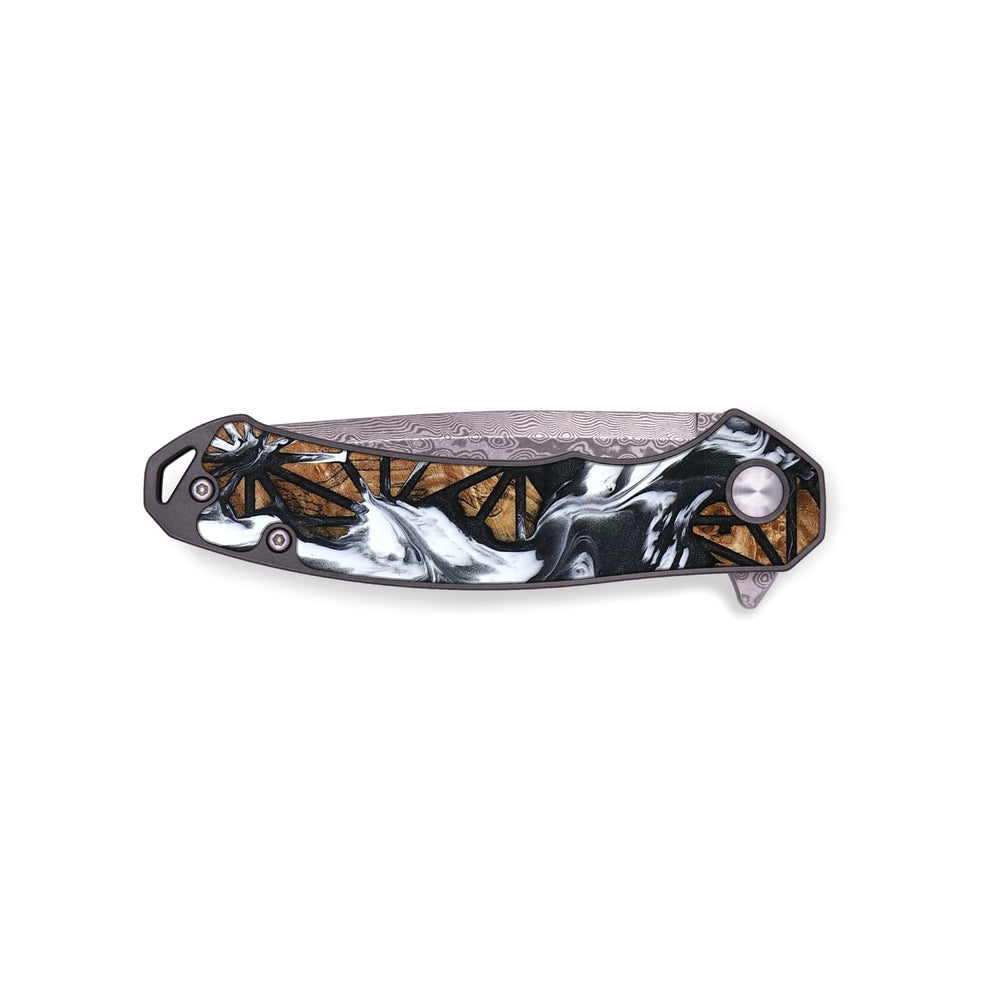 Experience the perfect blend of form and function with our durable folding pocket knife, featuring a lightweight titanium handle. The Damascus stainless steel blade is complemented by a unique wood burl and resin inlay. Imported blade and handle.