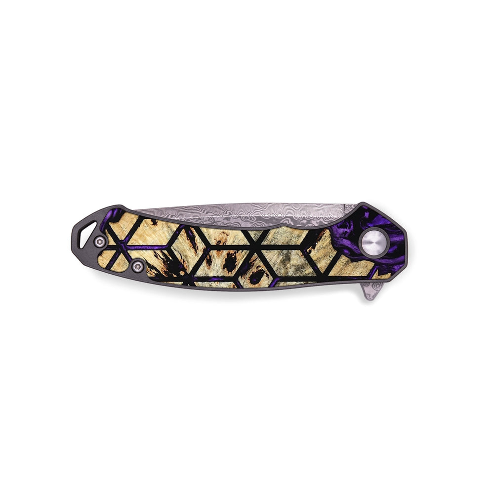 Experience the perfect blend of form and function with our durable folding pocket knife, featuring a lightweight titanium handle. The Damascus stainless steel blade is complemented by a unique wood burl and resin inlay. Imported blade and handle.