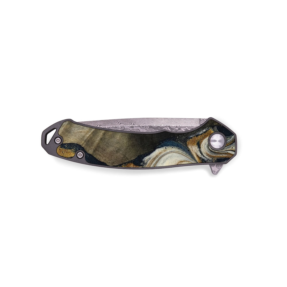 Experience the perfect blend of form and function with our durable folding pocket knife, featuring a lightweight titanium handle. The Damascus stainless steel blade is complemented by a unique wood burl and resin inlay. Imported blade and handle.