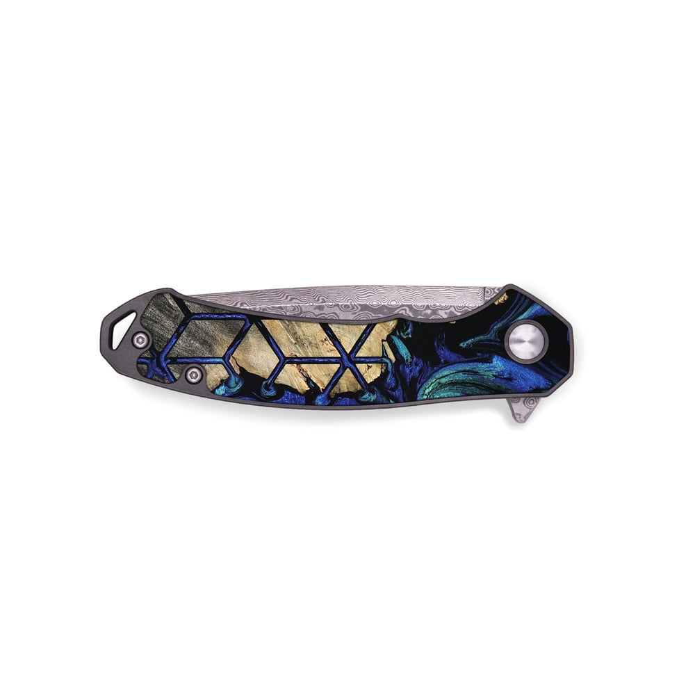 Experience the perfect blend of form and function with our durable folding pocket knife, featuring a lightweight titanium handle. The Damascus stainless steel blade is complemented by a unique wood burl and resin inlay. Imported blade and handle.