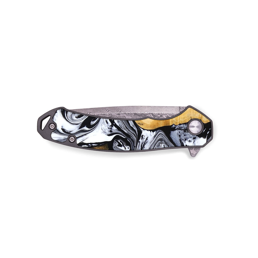 Experience the perfect blend of form and function with our durable folding pocket knife, featuring a lightweight titanium handle. The Damascus stainless steel blade is complemented by a unique wood burl and resin inlay. Imported blade and handle.