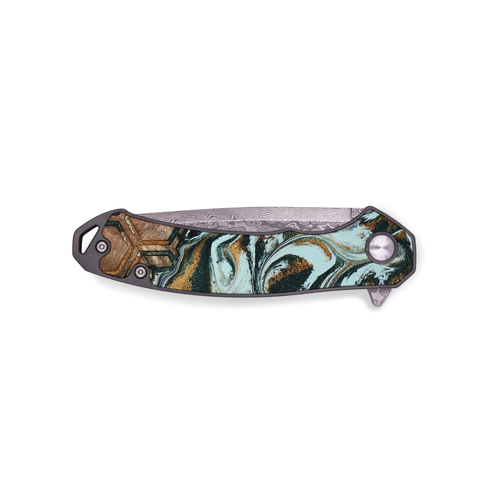 Experience the perfect blend of form and function with our durable folding pocket knife, featuring a lightweight titanium handle. The Damascus stainless steel blade is complemented by a unique wood burl and resin inlay. Imported blade and handle.
