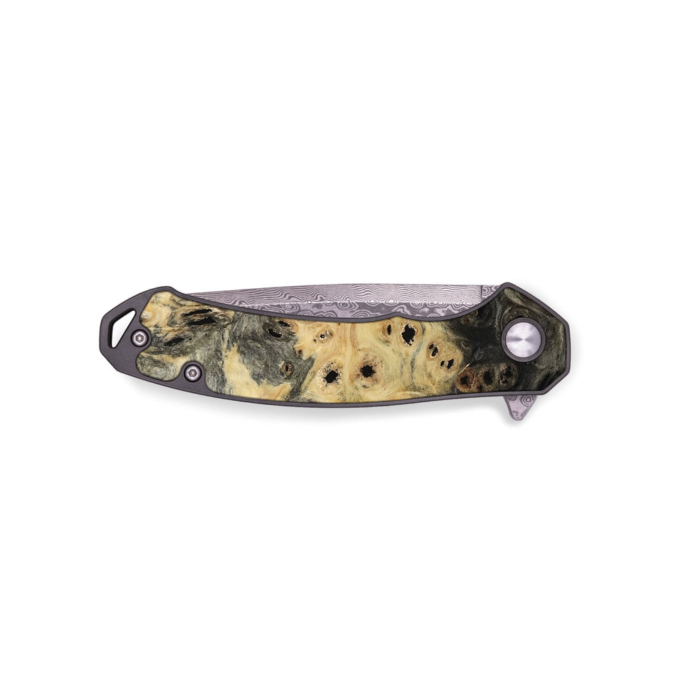 Experience the perfect blend of form and function with our durable folding pocket knife, featuring a lightweight titanium handle. The Damascus stainless steel blade is complemented by a unique wood burl and resin inlay. Imported blade and handle.