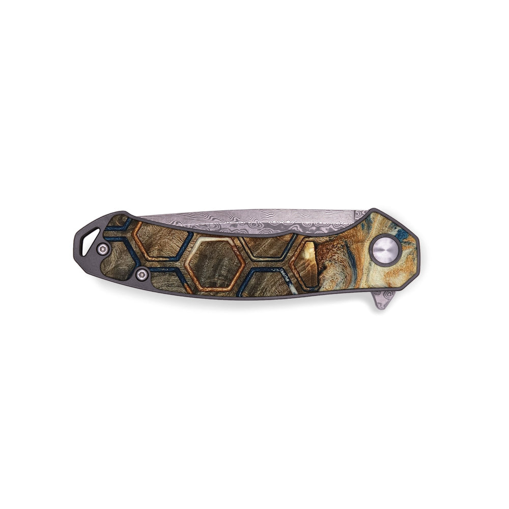 Experience the perfect blend of form and function with our durable folding pocket knife, featuring a lightweight titanium handle. The Damascus stainless steel blade is complemented by a unique wood burl and resin inlay. Imported blade and handle.