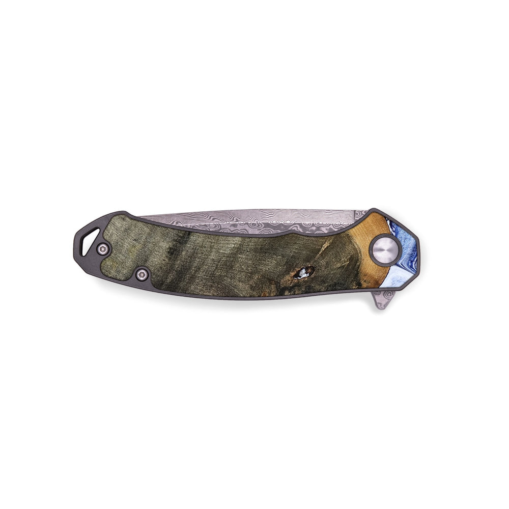 Experience the perfect blend of form and function with our durable folding pocket knife, featuring a lightweight titanium handle. The Damascus stainless steel blade is complemented by a unique wood burl and resin inlay. Imported blade and handle.